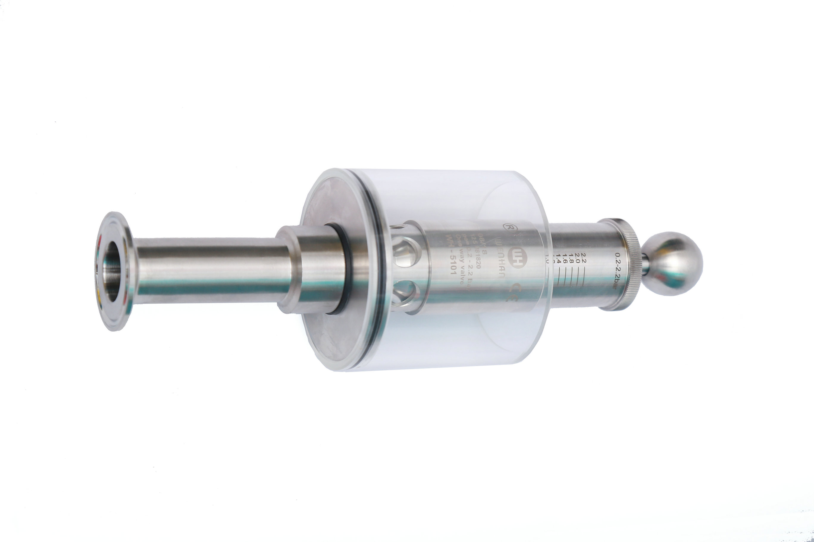 Wh-5101D鏈接;快裝 卡箍 管徑;直管式 Φ28*1.5 內部設計壓力;由彈簧控制 , 工作介質;氣體。手動式,旋鈕調節刻度壓力。